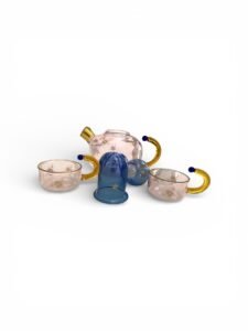 As xícaras, em vidro transparente, acompanham o bule com a mesma linguagem estética: pintura manual cuidadosa, filete de ouro aplicado à mão e pequenas variações que tornam cada peça única. As alças coloridas acrescentam charme e personalidade, reforçando o caráter autoral do conjunto.
