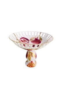 Uma peça que une tradição e sofisticação – fruteira em porcelana portuguesa com pe nacional, pintada a mão com detalhes em folhas em ouro.
