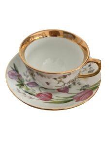 Xícara de chá de porcelana com flores e rico detalhes em ouro.